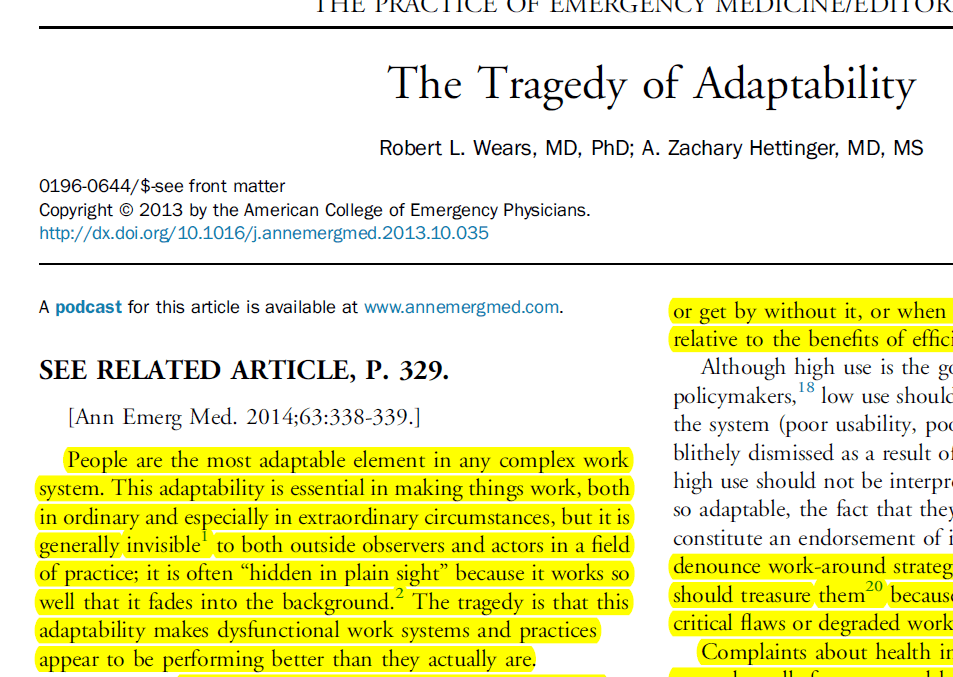 “adaptability makes dysfunctional work systems and practices appear to be performing better than they actually are. In the end, these invisible adaptations, filling gaps as they appear, can leave frontline workers “twisted like pretzels” around poorly designed or frankly dysfunctional systems as they contort themselves to get their work done” (p.338).