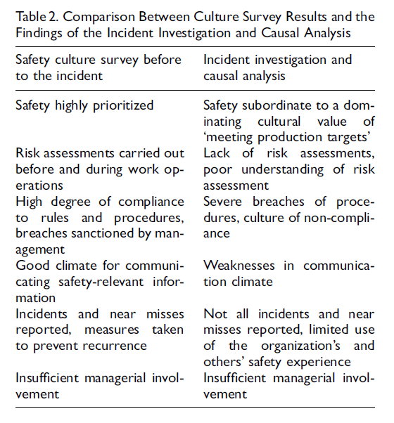 According to the investigation report, a range of deficiencies were found relating to compliance with procedures, lack of understanding of risk assessments, insufficient management involvement and more. Some of these directly contradicted the SC survey data at a time point before the accident.