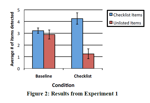 In summarising experiment 1, the authors state that “although checklists confer an advantage relative to baseline for listed items, they impair participants’ ability to detect unlisted items” (p1529).
