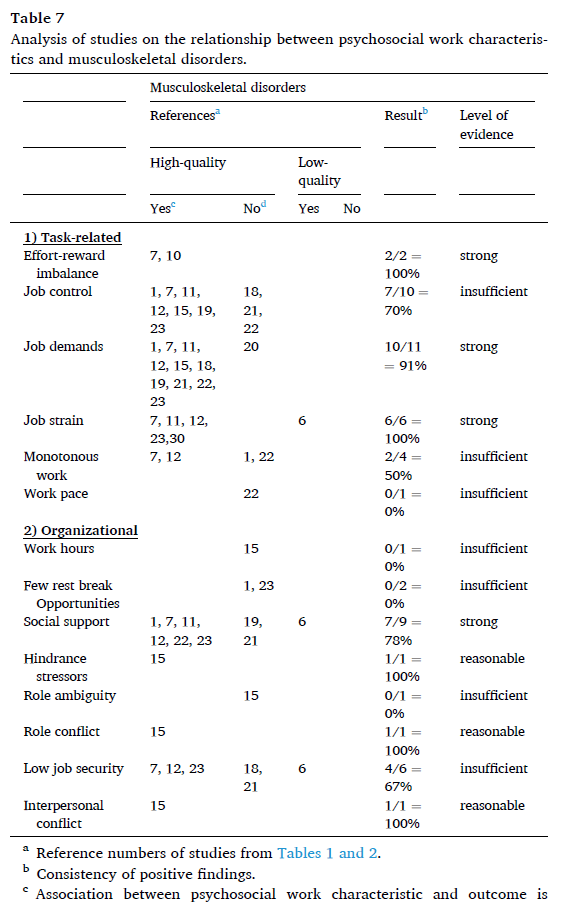 This study is pretty useful if you’re after the data for the quality of evidence for psychosocial risk factors on musculoskeletal disorders and absenteeism. The findings from 24 systematic reviews or meta-analyses and six longitudinal studies were reviewed.