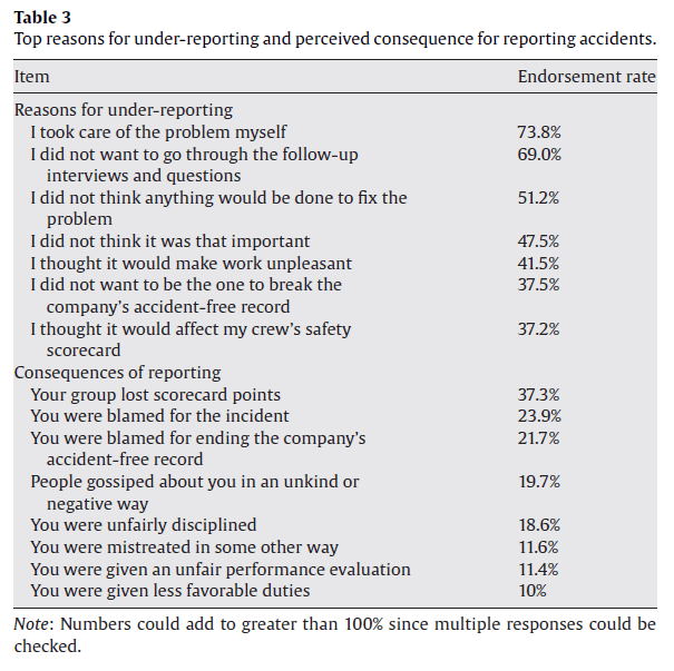 Some previous research was highlighted, where up to 68% of all workplace accidents and injuries went unreported in the OSHA national reporting system. Other data from the same author found that nearly 78% of experienced accidents went unreported in one study and in another study employees failed to report over half of all experienced accidents to their supervisors. Hence, with several studies the authors note that “the accumulated evidence suggests that under-reporting is a prevalent phenomenon” (p1439).