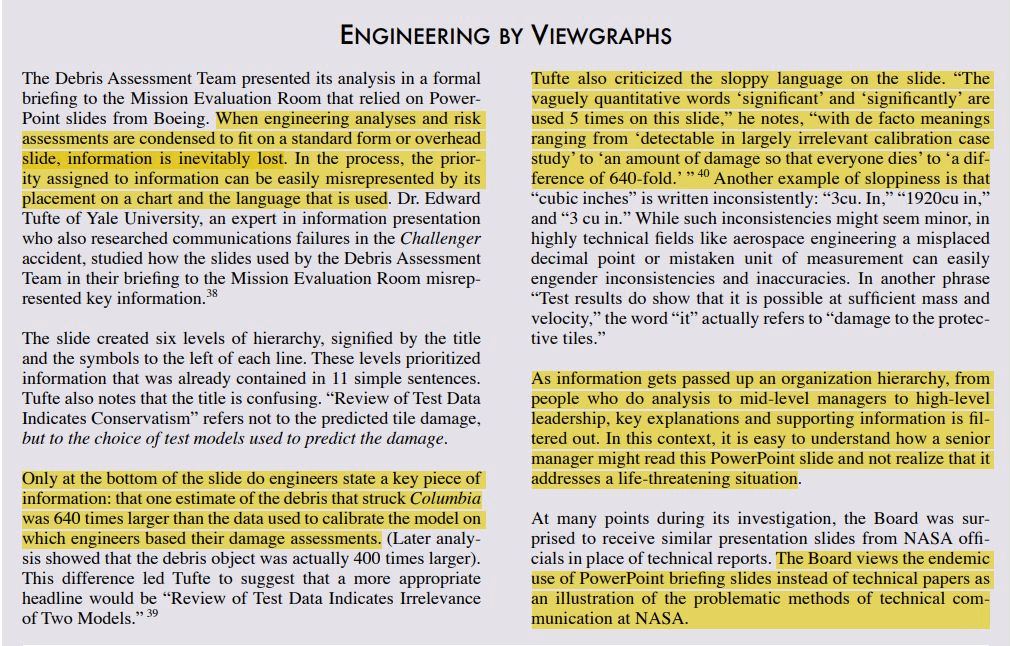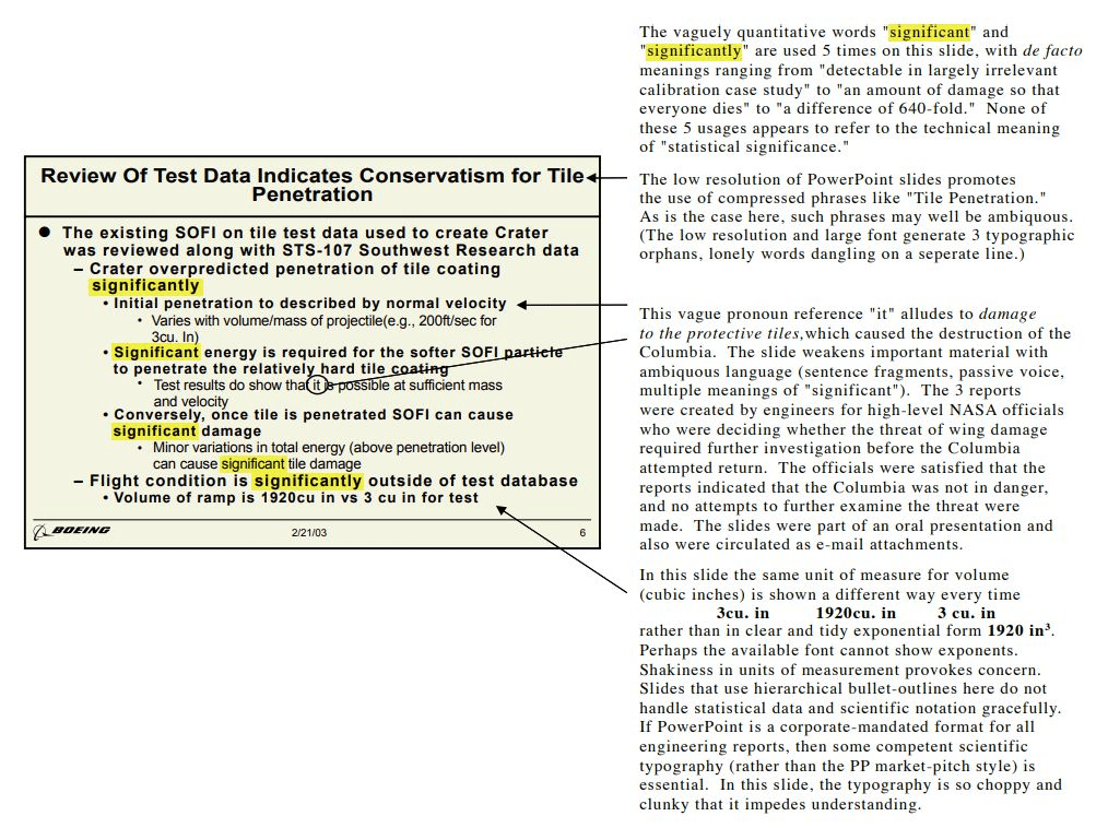 One element relates to the communication of safety-critical information (images below from chapter 7 of the CAIB report, pg.191). According to Edward Tufte, the PowerPoint slides prepared to report on the threat of debris impact to the shuttle tiles contained “quite optimistic” high-level executive summaries and big-bullet items, whereas the lower-level bullets contained doubts and uncertainties.