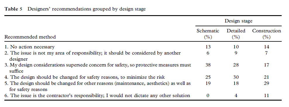 - In many specific situations where changes to aesthetics might have reduced exposure to hazards during construction, designers overall expressed the view that the workers and contractors were themselves responsible for their safety, and that if only they would abide by all the regulations, it would be possible to build any design without accidents. This attitude favours mitigation (by using personal protective equipment, using temporary railings, following standard procedures, etc.) over changing design to eliminate hazards. (pg. 70)