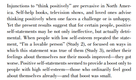 Interestingly, repeating positive self-statements or focusing on if the statement was true among people with low self esteem felt worse than those who didn’t repeat the positive statements.