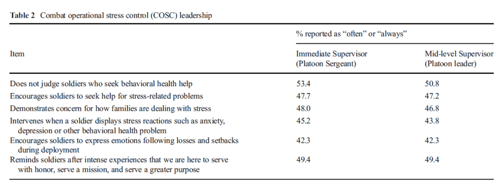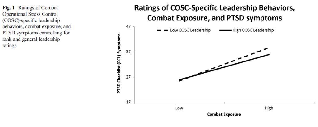 One emerging approach focuses on domain-specific leadership behaviors that may moderate the impact of combat deployment on mental health. In a recent study, US soldiers deployed to Afghanistan rated leaders on behaviors promoting management of combat operational stress. When soldiers rated their leaders high on these behaviors, soldiers also reported better mental health and feeling more comfortable with the idea of seeking mental health treatment. These associations held even after controlling for overall leadership ratings. Operational stress leader behaviors also moderated the relationship between combat exposure and soldier health.