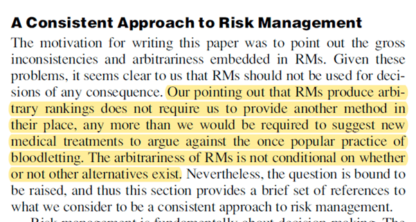 Now, whether you agree or not with this sentiment or believe matrices can or can’t be beneficial (which isn’t what I’m arguing here), the authors highlight that describing the structural flaws and arbitrary rankings from matrices “does not require [anybody] to provide another method in their place … [the] arbitrariness of [some risk matrix results] is not conditional on whether or not other alternatives exist” (p63) **.