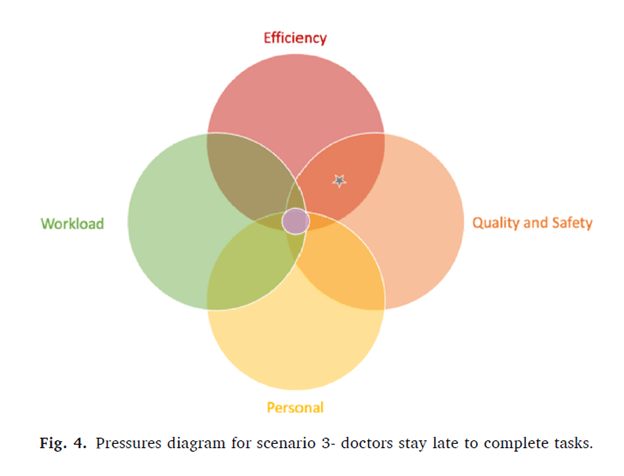 They then discuss the use of the pressures diagram – highlighting how it can provide insight into particular scenarios and team trade-offs over time – particularly “the interconnected pressures that impinge on healthcare work, the dynamic risk trade-offs that individuals and teams make as they navigate the system, and the dangers of a healthcare system under pressure” (p6).
