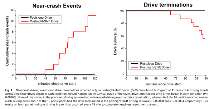 - That is, “deficits in driving performance outcomes (lane crossings) and physiological measures indicative of drowsiness were also evident from the outset of the drive, indicating that impairment among these night-shift workers occurred within the first 15 min of postnight-shift driving” (p180).