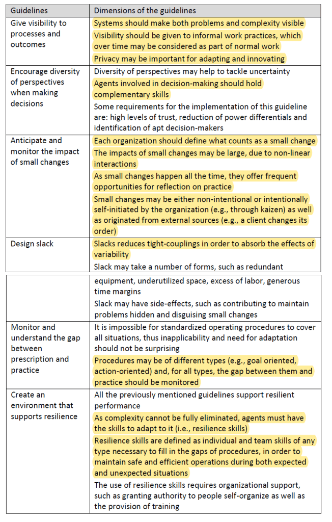 The paper notes some trade-offs that may be created by the guidelines. E.g. visibility of processes may conflict with the need for privacy, anticipation and monitoring may generate info overload, and increasing slack may disguise and absorb problems – increasing the need for more monitoring.