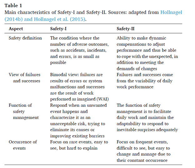 Providing context, they argue that “Safety-II is arguably more important for highly complex socio-technical systems, in which strict compliance with standardized operating procedures is not always possible nor sufficient for effective safety performance” (p1), and further argue Safety-II “grows in importance when the benefits from Safety-I achieve a plateau, to the point of Safety-I being itself a hindrance to further progress” (p1).