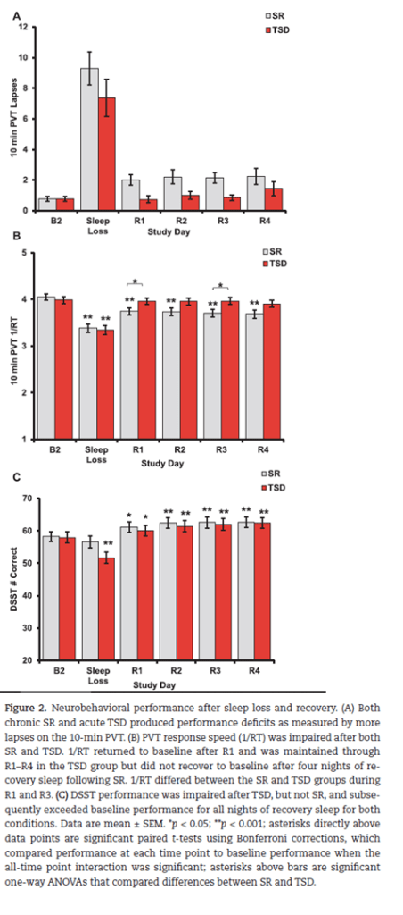 Another interesting study which explored the impact of both total sleep deprivation (TSD; staying awake during normal sleep periods) and chronic sleep restriction (SR; smaller amounts of sleep lost per sleep period over a longer period) on the recovery time in psychomotor vigilance (reaction time tests), a maintenance of wakefulness test (to measure physiological sleepiness), subjective sleepiness and polysomnography.