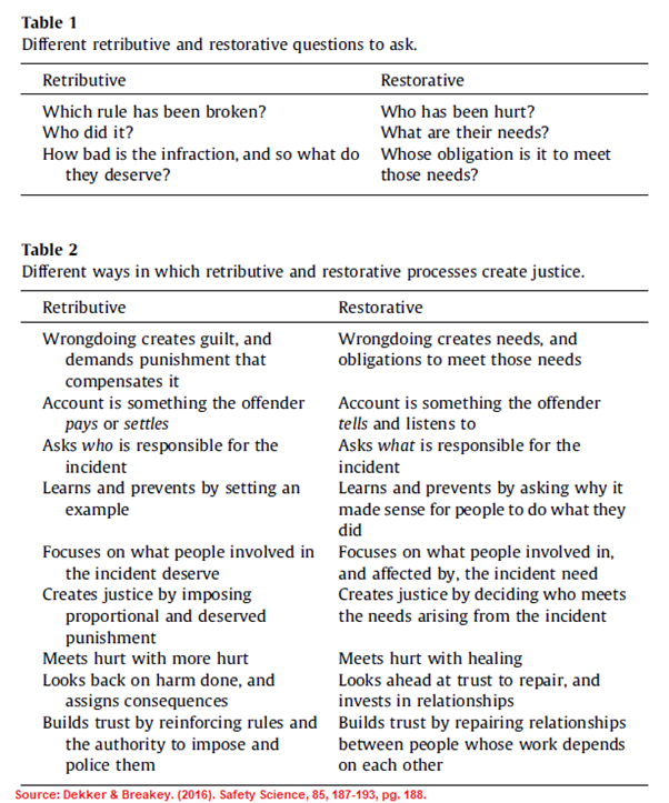 Just culture vs blame culture / restorative culture vs retributive culture / learning culture, informed culture / restorative justice, blame logics, retributive logics and more.