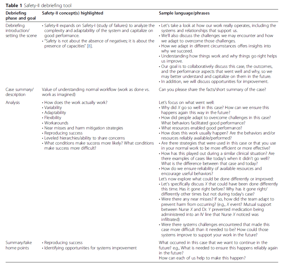 They argue that while debriefing is not new or uncommon, “many common debriefing strategies are more focused on Safety-I” (p1), e.g. more focused on learning from what went wrong and not enough focus on normal work and how work occurs due to capacities, adjustments, variation and adaptation in complex systems.