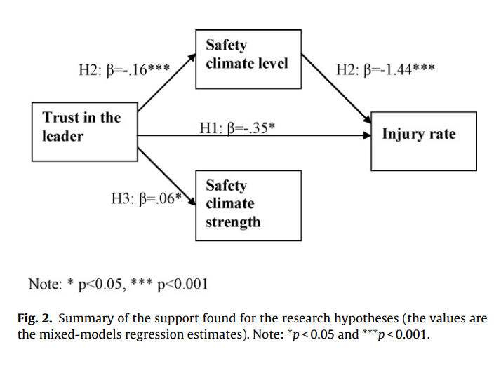 - Safety climate fully mediated the relationship with trust on injury rate. That is, in this sample trust acted fully in the context of safety climate. The authors explained “It is evident that trust in the leader is related to high climate level, which in turn is related to better safety performance” (p1292). They argue that this finding, that trust didn’t have its own direct relationship, may be because of the military setting.
