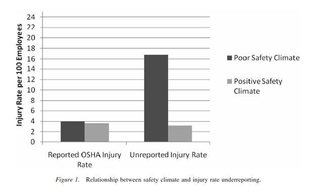 - Despite the difference in unreported injuries to OSHA between companies with better vs poorer safety climate performance, “there was no significant difference in the injury rates reported to OSHA” (1152)