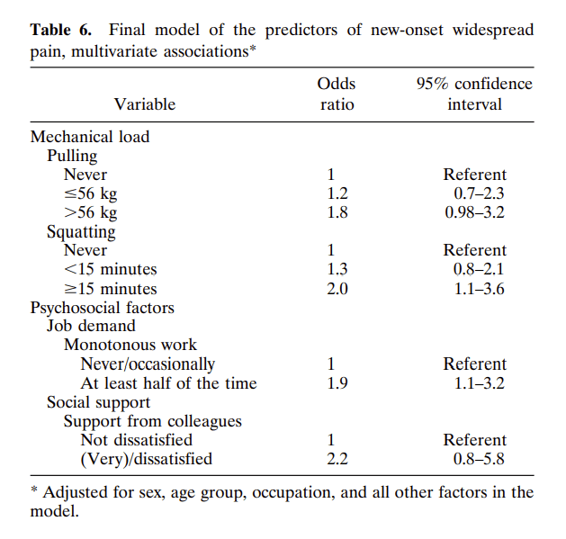 In multivariate models, they found that new-onset pain in any 12-month period increased 11% where people were not exposed to the studied mechanical or psychosocial factors, whereas people who were exposed to 3 factors (pulling >56 lbs, squatting >15 mins, monotonous, low support from colleague) had new-onset up to 60% higher.