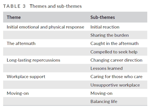 Workplace support post-event varied between workplaces. Only 2 of the 10 participants felt well cared for after the event (by way of immediate debriefing, counselling opportunities and follow-up comms from managers).