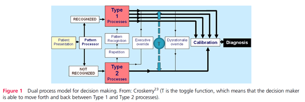 Notably, the below model doesn’t imply that a single reasoning mode accounts for diagnostic errors, nor one is preferable over the other. More likely is that decisions involve varying degrees of interactive combinations between the modes. Further, a high degree of type 1 processing is some circumstances is essential and lifesaving, whereas in other situations more deliberate rationalistic and reflective processing is needed.