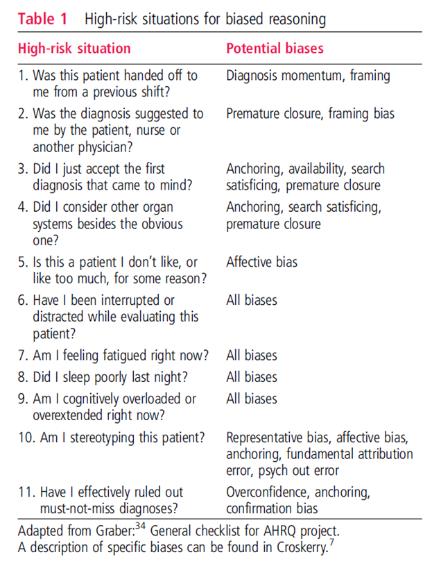 Authors: Croskerry, P., Singhal, G., & Mamede, S. (2013). Cognitive debiasing 1: origins of bias and theory of debiasing. BMJ quality & safety, 22(Suppl 2), ii58-ii64.