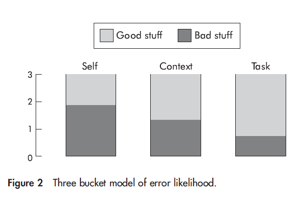 Unfortunately, for a paper focusing on building better mental and structural capabilities for people to maintain performance in the face of system failures, I think the error wisdom part of the paper was the least developed argument. Instead of talking about these capabilities and non-technical skill development etc. in depth, the paper focused more on the dubiously useful 3 bucket metaphor.