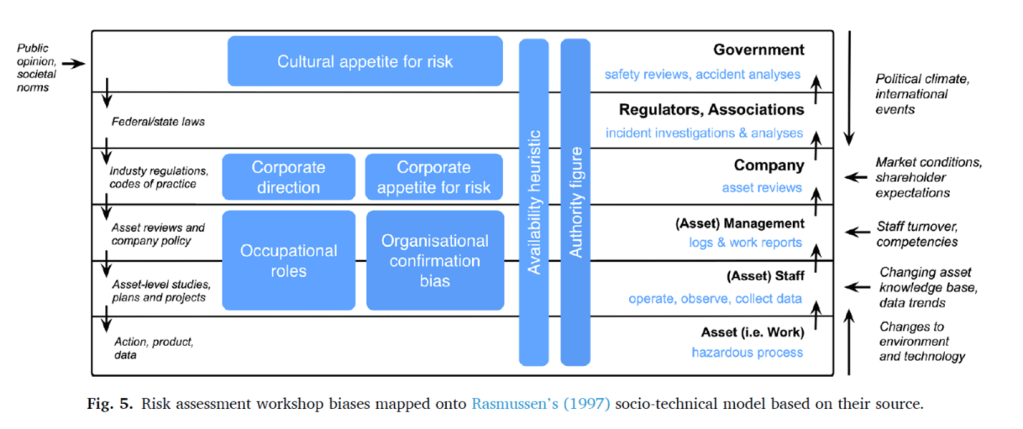 This study investigated biases in the context of risk assessment workshop facilitation and then mapped these against Rasmussen’s socio-technical systems model.