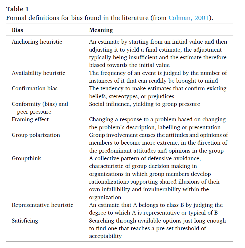 · Individual biases were seen to largely act via authority or cognitive heuristics. Availability heuristic was seen to influence attendees. Authority figures “was found to be an endemic problem of the