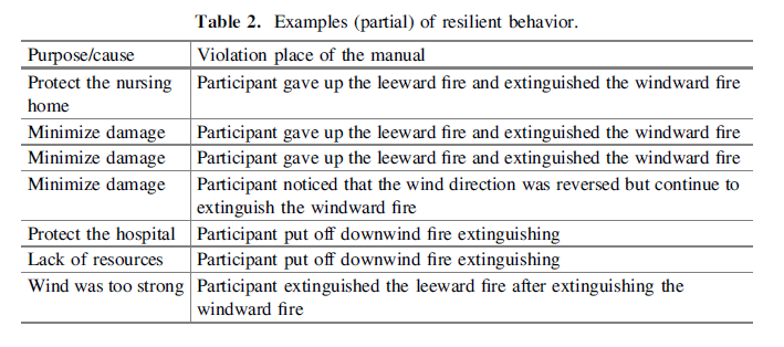 Failure of a task was regarded as when the fire spreads to more than 70% of the building/city. As noted above, successful responses were higher when people adaptively responded to the situation rather than rotely following the manual such that “there are few failures in cases with resilient behavior when the situation fluctuation is large” (p514).
