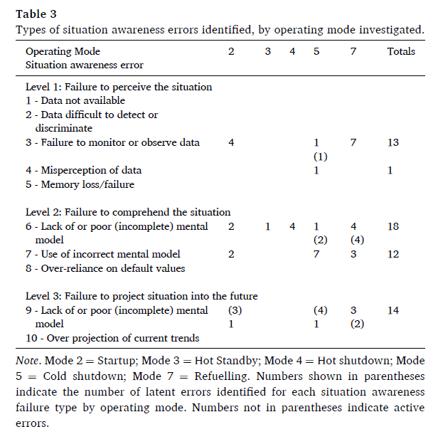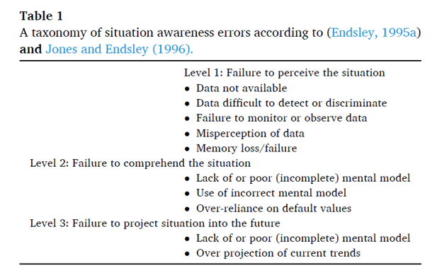 58 nuclear plant events were analysed and they drew on Endsley’s 3 level SA framework, below: