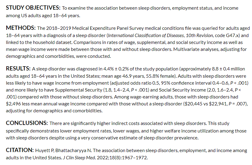 This study explored the relationships between sleep disorders, employment status and income among US adults.