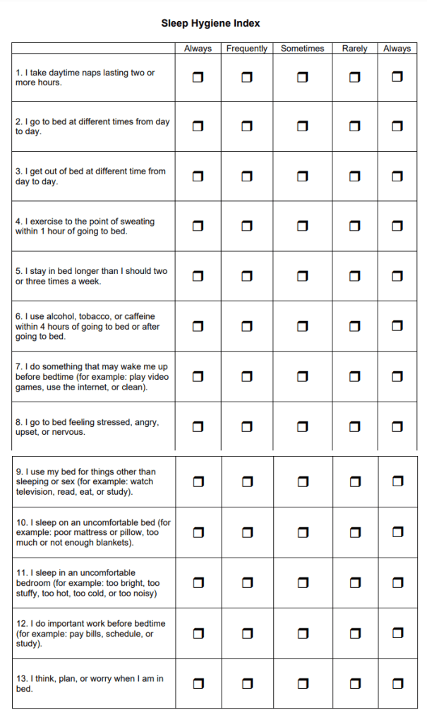 If you’re a shift worker and/or have sleep-related issues and have not yet assessed your sleep hygiene, then the sleep hygiene index from David Mastin et al. is a quick, 13-item assessment.