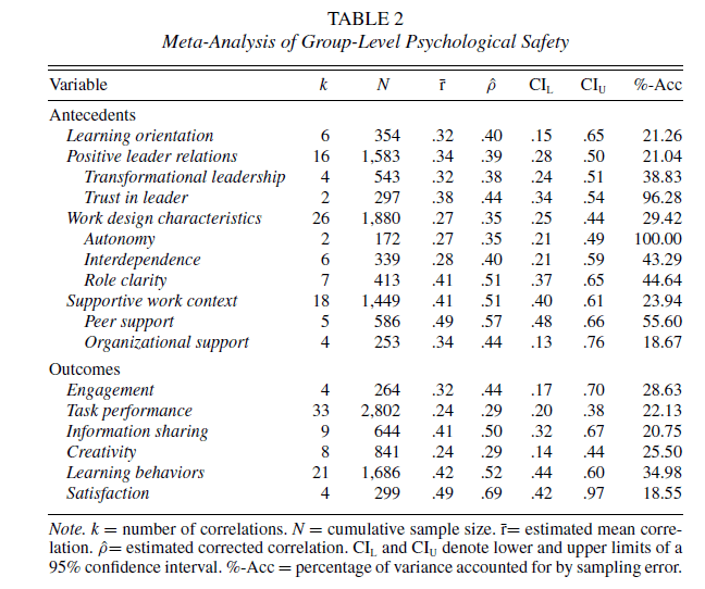 A comprehensive meta-analysis that evaluated 117 studies around antecedents to Psychological Safety (PS), how it influences task performance & citizenship behaviours, & how it’s related to leader relations.