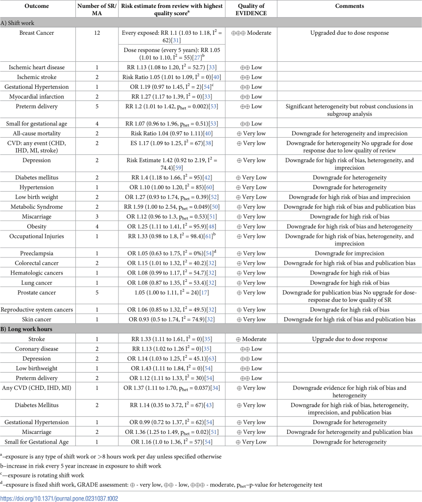 Authors: Rivera AS, Akanbi M, O’Dwyer LC, McHugh M (2020) Shift work and long work hours and their association with chronic health conditions: A systematic review of systematic reviews with meta-analyses. PLoS ONE 15(4): e0231037.