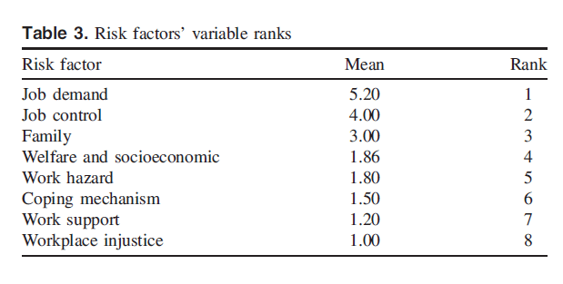 Risk factors were grouped under: job control, work support, job demand, coping strategy, work hazards, family, workplace injustice, welfare & socioeconomic factors. Working >60h per week, work overload, low ability to participate in decision making & occupational climate were most the most identified risk factors.