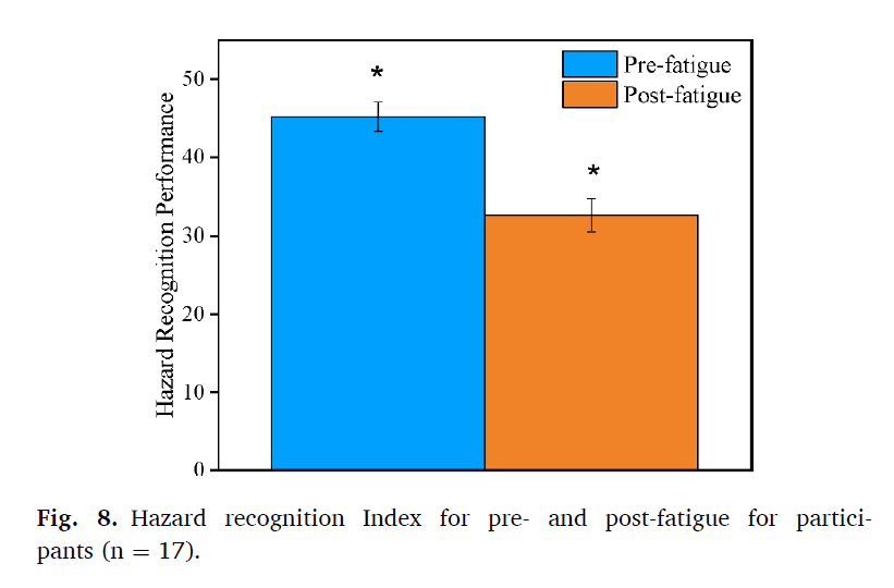 Participants who were physically fatigued were less likely to identify hazards and “especially ones that were not immediately obvious. Additionally, their perception of safety risks dramatically decreased, which indicates that workplace accidents, regardless of their severity, would be more likely to occur when workers are tired” (p11).