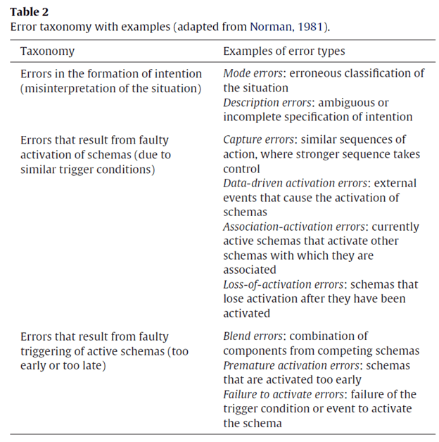 · Schema theory has provided mechanisms of human performance failure. This study drew on Norman’s 1981 taxonomy, shown below