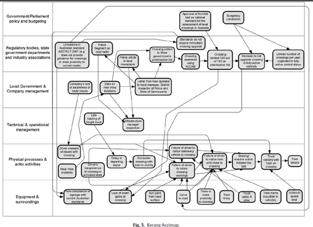 That is, factors across the whole sociotechnical domain “conspired to place the truck and train at the crossing together at the same time … and which facilitated the truck drivers failure to see and perceive the flashing warning lights and the approaching train” (p1286).