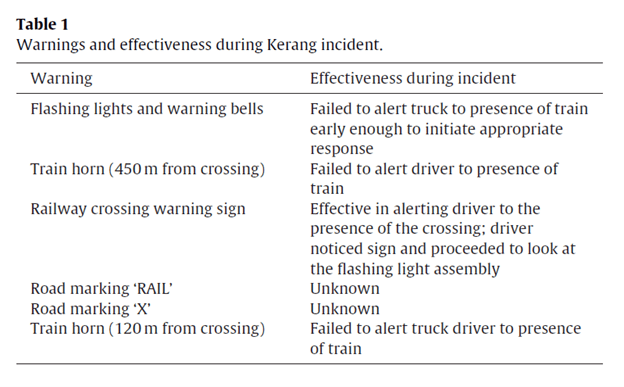 · The first horn sounding from the train failed to alert the truck driver – perhaps not of sufficient intensity or a low expectation from the driver of an approaching train may have led “to the driver being biased against detecting this stimulus of train horns” (p1283)