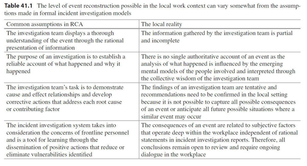For instance, an assumption could be that investigations should establish reliable accounts of what happened and why. In contrast, based on local rationality in complex systems, they suggest that there may not always be a “single authoritative account of an event as the analysis … is influenced by the emerging mental models of the people involved”.