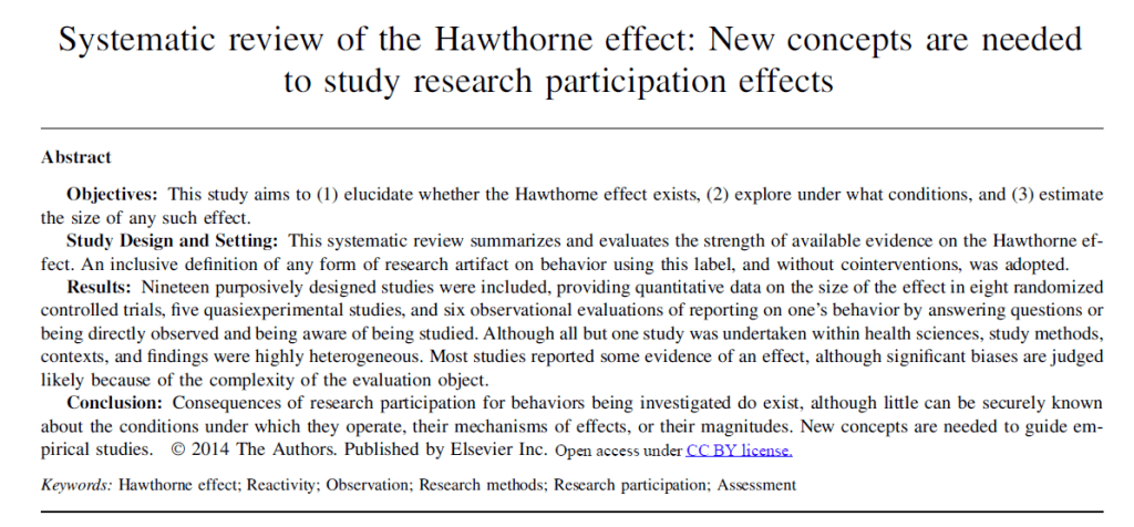 A 2014 systematically reviewed evidence of the Hawthorne effect dating back decades – including 19 papers that met quality criteria (virtually all from healthcare/health sciences).