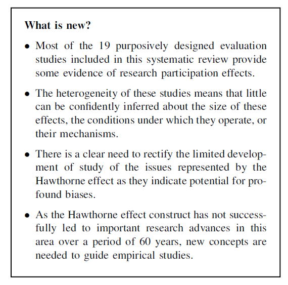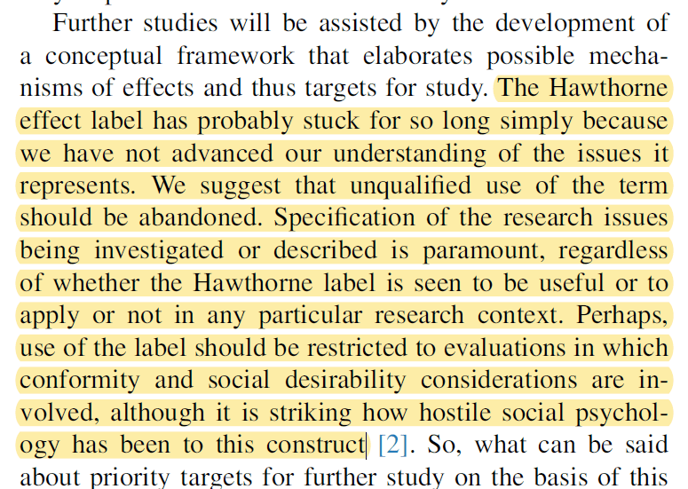 That is, they argue that “there is no single Hawthorne effect” (p276, emphasis added) and that unqualified use of the term should be abandoned“ (p276). Moreover, it’s said that this construct is “an inadequate vehicle for advancing understanding of these issues” since it has, seemingly, resulted in little progress on the conceptualisation over many decades.