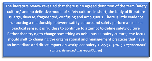 Pointedly, Borys suggests that perhaps “Safety culture qualifies as a myth because it has become a popular belief that appears to be an unfounded, false notion” and “Now may be the time to gently cast aside the construct of ‘safety culture” (p17).