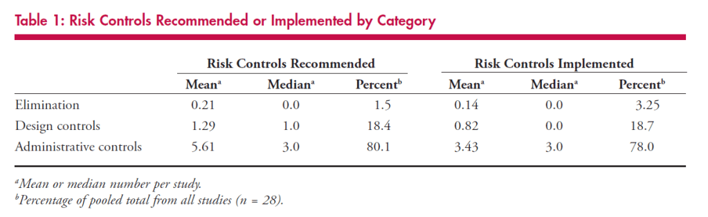 Interestingly, in studies which reported the success of the risk controls, studies which described the use of elimination or design controls were “1.6 times more likely to have explicitly reported success than those that described the use of administrative controls alone” (p.7).