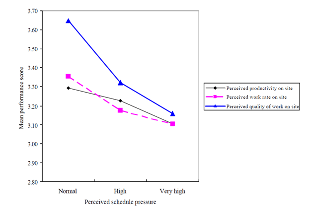 Moreover, productivity and work rate are negatively related to the schedule pressure, and a statistically significant negative correlation between work quality and schedule pressure. Thus, they infer that “an excessive schedule pressure can be detrimental to on-site performance” (p10). As noted in their figure below, “there is a definite downward trend in productivity, work rate, and quality of work when the schedule pressure increases” (p10).