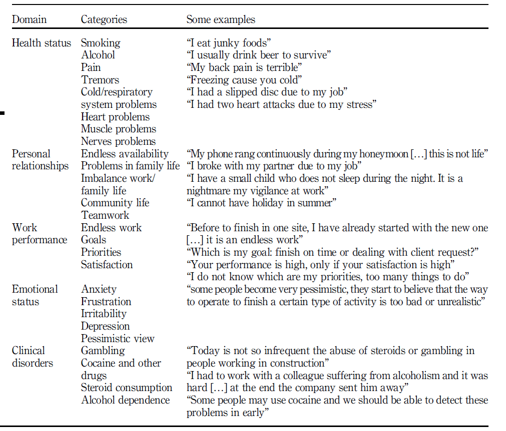 Tight deadlines also contributed to stress via excessive workloads, impacting personal/family time on weekends or after work. Almost all of the construction workers spoke about the long work hours they spent on site. High workload and impaired social life created anxiety, as did work intensity where a new site was opening before the current one was closed off.