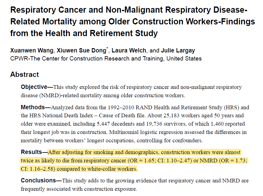1. Wang, X., Dong, X. S., Welch, L., & Largay, J. (2016). Respiratory cancer and non-malignant respiratory disease-related mortality among older construction workers-findings from the health and retirement study. Occupational medicine & health affairs, 4.