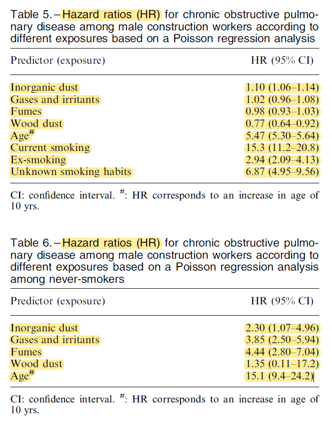 The second study from Bergdahl et al. (2004) looked at COPD in Swedish construction workers exposed to inorganic dust. This included asbestos, artificial mineral fibres, cement, concrete and quartz dusts, gases and irritants, fumes and wood dust.