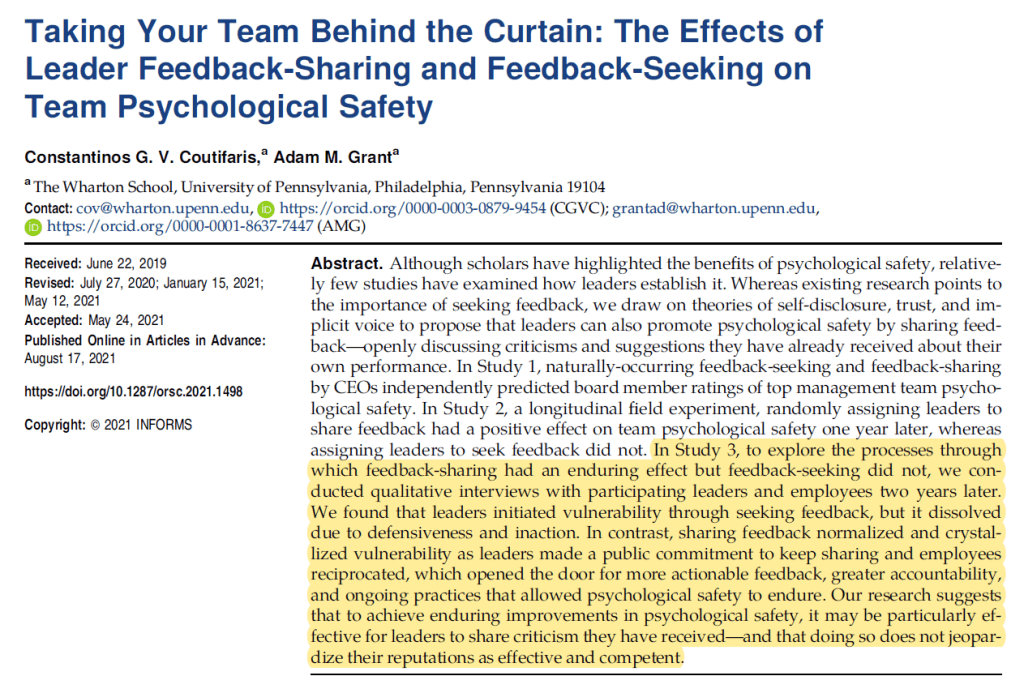 Authors: Coutifaris, C. G., & Grant, A. M. (2022). Taking your team behind the curtain: The effects of leader feedback-sharing and feedback-seeking on team psychological safety. Organization science, 33(4), 1574-1598.