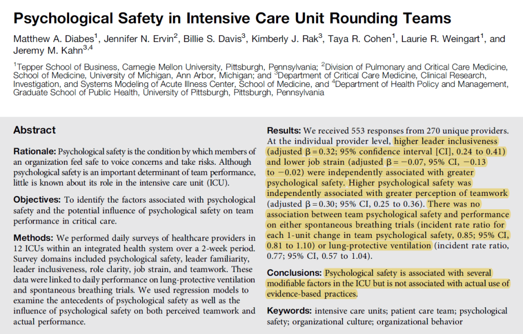 Authors: Diabes, M. A., Ervin, J. N., Davis, B. S., Rak, K. J., Cohen, T. R., Weingart, L. R., & Kahn, J. M. (2021). Psychological safety in intensive care unit rounding teams. Annals of the American Thoracic Society, 18(6), 1027-1033.
