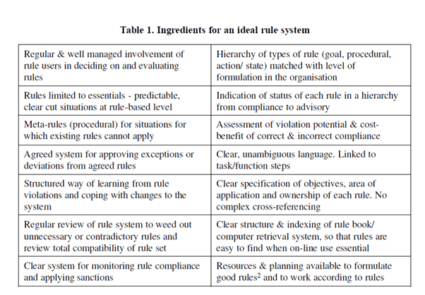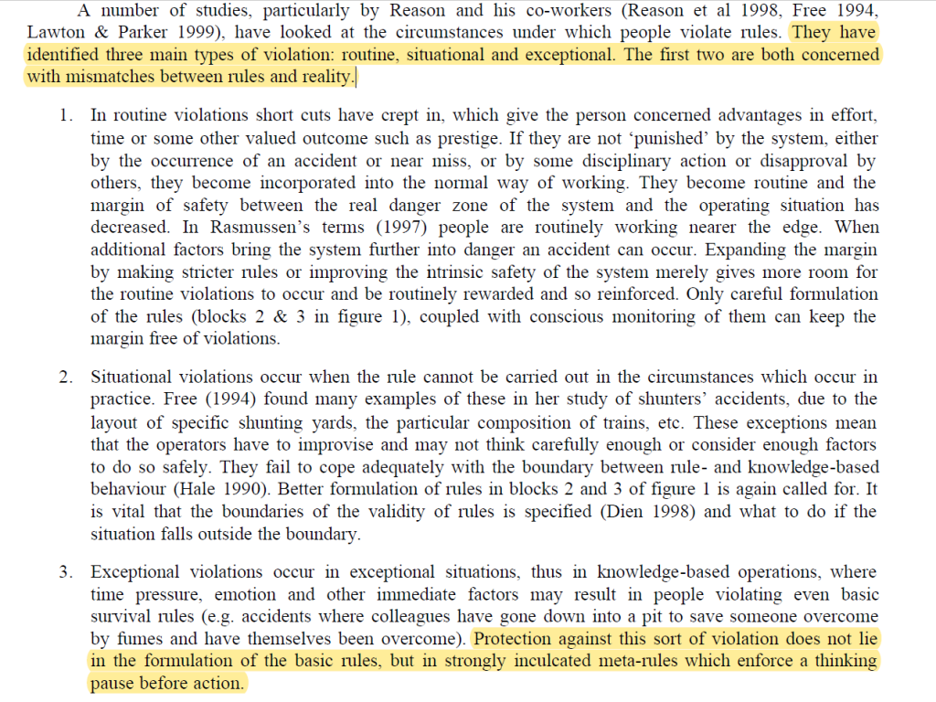 2) Situational departures – these occur when rules can’t be carried out in the circumstances which occur in practice. This involves some level of improvisation. Here they note that it’s vital organisations ensure that “the boundaries of validity of rules is specified”.