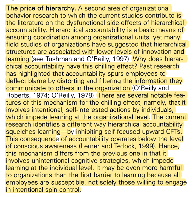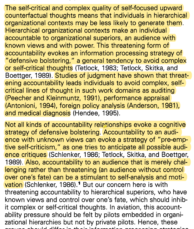 More interesting is the negative effect of organizational accountability on learning. They found that hierarchical accountability impacted the use of self-focused upward counterfactuals.